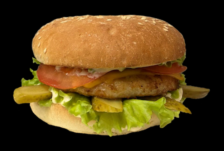 Состав: булочка, лис салата, котлета куриная, соус "Сырный", маринованный огурец, помидор, сыр плавленный сэндвич.