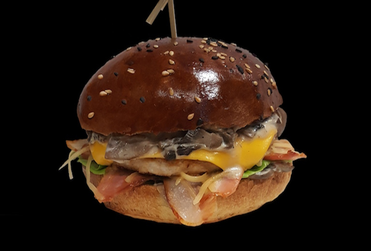 Состав: котлета куриная, салат сезонный, соте грибное, бекон жареный, сыр сливочный, сыр "Пармезан", лук жареный "Фри".