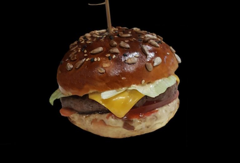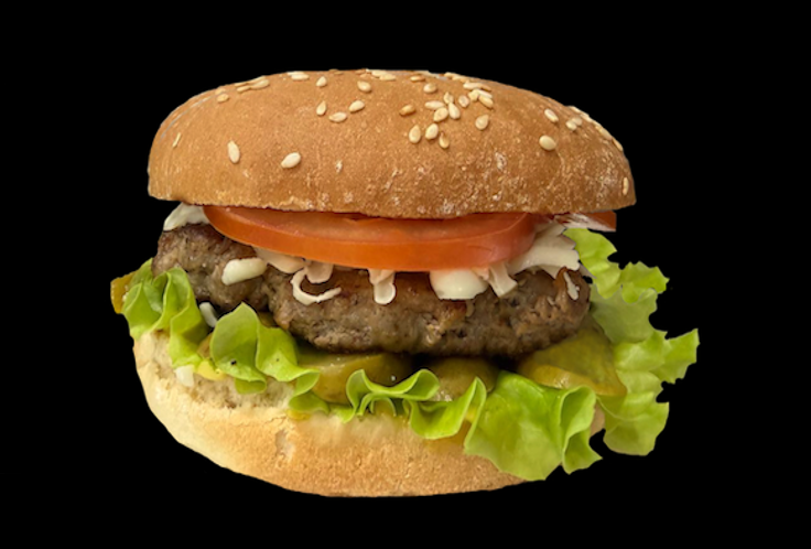 Состав: котлета говяжья, сыр "Чеддер", томат, салат сезонный, соус "Хреновый", лук мармелад.