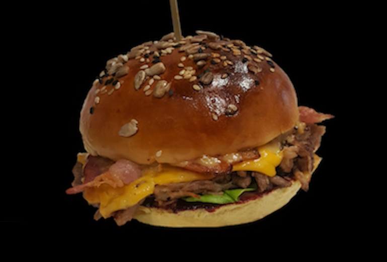 Состав: свинина рваная в пиве, сыр "Чеддер", огурец жареный, бекон жареный, перец Халапеньо, салат сезонный, лук фри, барбекю ягодный, медово-горчичный майонез, лук мармелад.