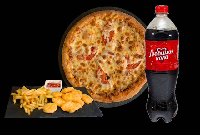 ✔️ Пицца Милано - 25 см ✔️ Наггетсы - 10шт. ✔️ Картофель фри - 100 г ✔️ Кола - 0,5 л ✔️ Томатный соус