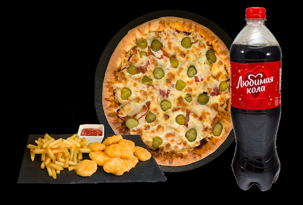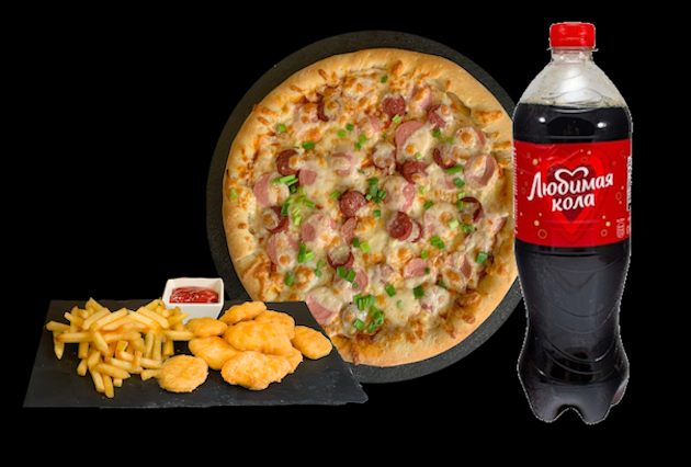 ✔️ Пицца Баварская - М ✔️ Наггетсы - 10 шт. ✔️ Картофель фри - 100 г ✔️ Кола - 0,5 л ✔️ Томатный соус